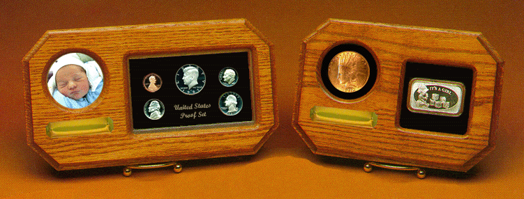 Champion Custom Oak Coin Frames™ are designed to hold a U.S. Proof set in its original case, a silver bar or single and multiple coins, all of which can be viewed from the front or back. All Champion Custom Wood Coin Frames™ come with a blank, brass colored, adhesive identification plate so your customers can personalize their treasure!